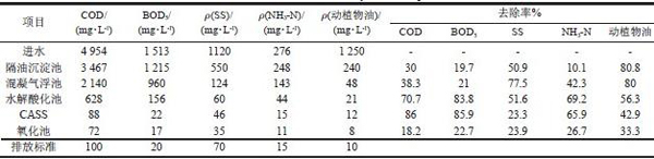 該廢水處理工藝建成后進行了調試運行,時間從2010 年6 月5 日-9 月20 日。6 月份主要進行活性污泥的接種馴化。7 月10 日左右開始通水。該廢水中的浮油、分散油、溶解油較多,因而在該工藝設計中,隔油沉淀池的穩定運行是保證該廢水處理工藝穩定運行的關鍵。在該項目運行過程中,對隔油沉淀池的運行嚴格管理。因該廢水COD 較高,同時廢水中含有大量的有機物如脂類和蛋白質。在2010 年8 月份中旬發現調節池不斷散發臭味,分析原因是由于該段時間氣溫較高,調節池中廢水由于厭氧腐化散發出臭味。通過在調節池增加曝氣設備,進行預曝氣,消除臭味帶來的影響,同時增加曝氣設施有利于后續混凝氣浮池的運行。在2010 年08 月份下旬,CASS 運行過程中發現活性污泥顏色變深,通過對CASS 反應池取樣分析,發現CASS 初始階段溶解氧質量濃度過低,大約0.5 mg/L,缺氧環境導致活性污泥顏色變深,同時出水中COD 由90 mg/L 增大到270 mg/L 左右。通過增大曝氣量,提高溶解氧質量濃度到3 mg/L 以上,出水水質不斷提高。2010 年12月11 日,檢測到出水水質變差,經分析發現是由于突然降溫至-5 ℃左右,水解酸化池微生物受到降溫的影響,活性降低,導致出水水質惡化。延長水解酸化池停留時間由6 h 提高到9 h,保證出水水質。在廢水處理工藝運行過程中,對員工的技術培訓非常重要,這也是影響該工藝穩定運行的一個重要因素。工藝調試進水期間(2010 年7 月10 日到09 月20 日)原廢水及水解酸化出水和CASS 出水COD 變化見圖2。該廢水處理工藝經調試運行,出水水質穩定,達到了設計的排放標準。各主要構筑物出水水質見表1。
