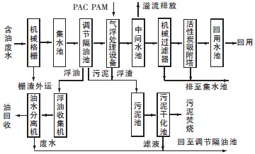 含油廢水經(jīng)調(diào)節(jié)隔油池后進(jìn)入氣浮設(shè)備,并投加混凝劑。通過(guò)破乳、油水分離后進(jìn)人中間水池。用污水泵提升進(jìn)入機(jī)械過(guò)濾器和活性炭吸附塔,經(jīng)深度處理后回用。
