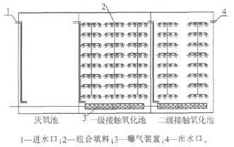 生物接觸氧化法兼有活性污泥法及生物膜法的特點,池內具有較高的容積負荷〔可達2.0 ~3.0kg/(m3·d)〕,另外接觸氧化工藝不需要污泥回流,無污泥膨脹問題,運行管理較活性污泥法簡單,對水量水質的波動有較強的適應能力,適用于含鹽有機廢水的處理。
