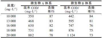 實驗使用微生物A 體系,在進水鹽度低于13 000mg/L,進水COD 低于3 000 mg/L 時,出水COD<450mg/L,達到食品行業廢水排入污水處理廠的排放標準(遼寧省污水綜合排放標準,DB 21/1627—2008)。體系B 在進水鹽度低于10 000 mg/L,進水COD 低于2 700 mg/L 時,出水才能達到上述排放標準。
