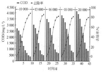 分別通過稀釋原水的方法配制成不同鹽度的多個等級的進水。相應的水中COD 也發生變化。