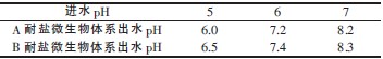 由表3可見,在A、B 兩個耐鹽微生物體系中,出水的pH 都有較大的變化,但是兩者差別比較小。原水初始pH=5 時,廢水中含有部分醋酸。在進水時使用NaOH 調節pH 后,形成醋酸鹽,在后續的生化處理過程中,醋酸逐漸被微生物代謝,使出水pH 增大。鑒于進水pH 對工藝處理效果影響不大,而且加堿中和會增大腌制廢水的鹽度,給廢水處理帶來更大的困難,后續鹽度和停留時間的單因素考察實驗進水pH=5。