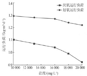 在進水COD 為3 000 mg/L,鹽度從10 000 mg/L增加到20 000 mg/L 時,考察了出水COD 的變化情況。為了更直觀地說明鹽度增加對各段工序處理能力的影響,考察的是各段工藝的實際運行負荷。具體情況如圖4 所示。