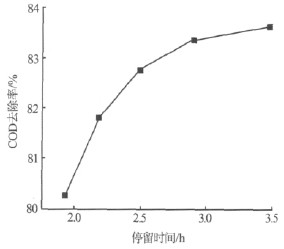 由圖5 可見,COD 去除率隨停留時間的增大而增大,但COD 去除率增長速率逐漸降低。當停留時間大于2.5 d 后,去除率增長緩慢,基本保持在82.5%~83.5%。說明在此范圍內增加停留時間,并不能有效地提高反應器的處理效率。考慮到工程應用的能耗因素,選取停留時間為2.5 d。具體參見http://m.xhxdt.com更多相關技術文檔。