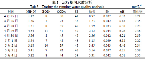 整個裝置2013 年下半年調試使用,2014 年4 月25 日~2014年5 月4 日出水水質分析,如表3,可以分析得出出入水質達到《山東省南水北調沿線水污染物綜合排放標準》(山東省地方標準DB37/599-2006)排放標準。具體參見http://m.xhxdt.com更多相關技術文檔。