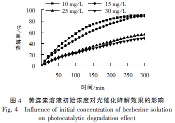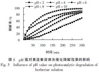 由圖5 可看出,隨著pH 值的升高,光催化降解率逐漸升高,pH 值為10 時,光催化效果最好。造成這種現(xiàn)象的原因可能是在堿性條件下,OH- 可充當(dāng)空穴的俘獲劑(h++OH-→·OH),有利于光催化的進(jìn)行;同時,堿性條件可能有利于黃連素大分子的分解。具體的原因有待進(jìn)一步分析。