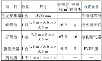 設計采用缺氧/好氧/一體式膜生物反應器處理工藝。缺氧池和好氧池合壁組建,通過溢流孔對污水進行導流。好氧池內安裝液位計,自控系統根據液位高低啟閉潛水泵以調節曝氣池內水量。一體式膜生物反應器為鐵制,將風機、出水離心泵、加藥槽、流量計等設備置于一室,可以提高設備空間利用率。膜反應器膜面積為400 m2,污水 處理系統采用人工和自動雙重控制。