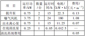 電價按0.6元/(kW·h) 計算,清洗藥劑主要為0.3%的燒堿、2%的檸檬酸或1%的鹽酸(膜孔堵塞、出水量減少時清洗) ,電費和藥劑費合計為1.33元/m3。