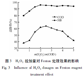 由圖3 可以看出,在m(H2O2)∶m(COD) 較小時,COD 和NB 的去除效果都在不斷增加,而當m(H2O2)∶m (COD) 達到2. 5 時,NB 去除率為94. 8%,而COD 去除率達到頂峰,為63. 2%,隨著m(H2O2)∶m(COD) 繼續增加,NB 去除率基本保持穩定在90% 以上,COD 去除率開始下降。當H2O2投加量較低時,由于H2O2不足,產生的·OH 量少,不足以使有機物充分降解,去除率較低,隨著H2O2投加量增大,產生的·OH 量也開始增多,全部參與有機物降解反應,而H2O2投加量過高時,反應開始大部分Fe2+就被氧化為Fe3+,沒有足夠的Fe2+來分解過量的H2O2產生更多的·OH,這樣既消耗了H2O2,又抑制了·OH 的產生,并且殘留的H2O2也使出水COD 值增高[19],使得處理效果又會降低。綜合考慮之后,Fenton 實驗H2O2最佳投加量m(H2O2)∶m(COD) 定為2.5,同時為有利于降解NB,H2O2投加方式采用分批投加[20]。