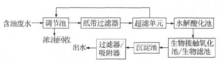 (2)超濾-生物接觸氧化/生物濾池工藝。該組合工藝在冷軋含油廢水的處理中應(yīng)用較為廣泛。超濾可以有效去除含油廢水中的SS 和油類物質(zhì),而生物接觸氧化/生物濾池可以去除廢水中大部分的COD。典型的超濾-生物接觸氧化/生物濾池工藝如圖 2 所示。在實際應(yīng)用中,通常根據(jù)需要在生物法后增加過濾或吸附工藝。