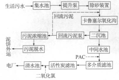 物化處理采用機械格柵、旋流除砂工藝去除生活污水中的雜物和泥砂〔2〕;生化處理采用卡魯塞爾氧化溝生化處理工藝分解、穩定和去除水中有機污染成分; 深度處理采用微絮凝過濾+生物活性炭濾池+消毒工藝,將生化處理后污水進一步澄清、過濾、消毒,達到地表水環境質量標準GB 3838—2002Ⅲ類要求,作為電廠循環冷卻水補充水。污泥采用污泥濃縮池+帶式壓榨脫水機的處理工藝,剩余污泥經污泥濃縮池濃縮后,由帶式壓榨脫水機壓榨脫水后外運填埋。