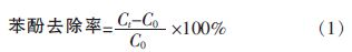 (2)苯酚去除率。取適量廢水定容于50 mL 容量瓶中,加入0.5 mL pH=10 的緩沖溶液,搖勻后加入質量分數為8%的鐵氰化鉀溶液1 mL 和1 mL 質量分數為2%的4-氨基安替比林溶液,放置10 min后于波長510 nm 處、水作參比溶液測定吸光度。由標準曲線計算苯酚含量,式(1)計算去除率: