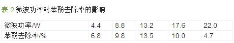 由表 2 可以看出,當微波功率較低時,苯酚去除率隨功率的增加而增大,微波功率為13.2 W 時苯酚去除率達到最高;當功率超過13.2 W 時,苯酚去除率反而下降。