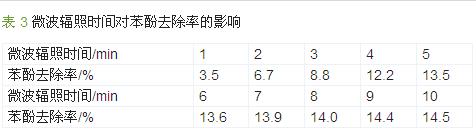 在微波功率為13.2 W 時,測定微波輻照時間對苯酚降解效果的影響,見表 3。由表 3 可見,苯酚去除率隨微波輻照時間的延長而增加,超過5 min 后去除率增加緩慢。因此選擇輻照時間為5 min。