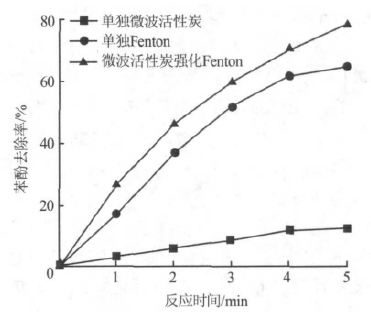 (1)微波輔助Fenton 處理含酚煉油廢水時以活性炭作為微波催化劑,微波功率13.2 W,輻照5 min,苯酚去除率可達到80%以上,COD 去除率達到50%以上;輻照10 min 時苯酚去除率可達到97%以上。
