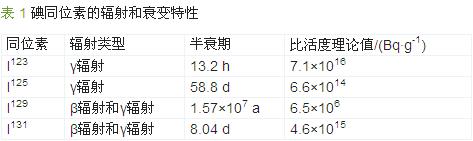 碘在自然界中以無機碘和有機碘的形式存在,主要化學形態有:碘離子(I-)、單質碘(I2)、次碘酸根(IO-)、碘酸根(IO3-)、碘甲烷(CH3I)等,碘的化學形態取決于水體的pH和氧化還原電位等環境條件〔13〕。碘的同位素約有26種,大部分為人工放射性同位素,其中天然存在和核設施中較為重要的同位素是125I、129I、131I,表 1給出了碘的同位素輻射類型和衰變特性〔1, 14〕。放射性碘對生物體的影響可以分為近期效應和遠期效應,切爾諾貝利核事故所造成的近期效應主要表現在事故發生的第一年共28人死亡〔3〕(與其他放射性核素共同產生輻射),長期效應主要表現為增加甲狀腺癌和白血病的發病率,尤其是甲狀腺癌發病率,并且兒童甲狀腺敏感性比成人高約5倍,射線誘發的甲狀腺癌發病率高于成人,這在切爾諾貝利核事故中也得到驗證。