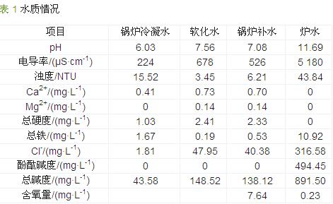 該廠的蒸汽鍋爐水系統主要分為鍋爐補水、爐水 與蒸汽冷凝回水三部分。其中鍋爐補水使用廠方自制的軟化水與蒸汽冷凝回水的混合水,冷凝回水與軟化水的混合比例大約是1∶4。該鍋爐水系統已經近3個月沒有進行水處理工作,此時蒸汽冷凝回水、自制軟化水、鍋爐補水以及爐水的水質情況如表 1所示。