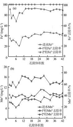 由圖 3(a)可知,1#柱對Fe2+的去除率達99.9%以上,2#柱對Fe2+的平均去除率為87.2%,均表現出良好的Fe2+去除能力。這是因為麥飯石具有以硅氧基〔SiO4〕4-為基礎的四面體晶體結構,在其末端通過離子鍵結合著Mg2+、Na+、K+、Ca2+等離子,當麥飯石處于水介環境時可發生部分離子化,形成大量活性基團〔-SiO〕-捕獲水中重金屬離子〔8〕。另外,由于1#柱中較高的pH可促進Fe2+形成氫氧化物〔Fe(OH)2、Fe(OH)3等〕絮凝體〔9〕,其在麥飯石的吸附作用下被強化去除,這可能是1#柱去除Fe2+效果優于2#柱的主要原因。