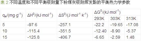 從表 2可以看出,ΔH0為負值,表明該吸附過程放熱,降低溫度有利于吸附,這與試驗的平衡吸附量的結果相一致。根據ΔG0的變化可以推測揮發酚在粉煤灰上的吸附機制,求得吸附自由能為-22.2~1.48kJ/mol,自由能變化<40kJ/mol,表明該吸附屬于物理吸附〔21〕。ΔG0為負,表明該反應過程是自發過程,ΔG0隨溫度的升高而增加,表明高溫不利于該吸附的進行。具體參見http://m.xhxdt.com更多相關技術文檔。