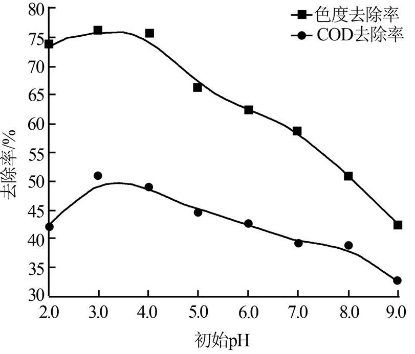 取水樣200 mL,用0.5 mol/L的 H2SO4調(diào)節(jié)pH,然后快速加入一定量的 Fe2+和S2O82-,攪拌反應(yīng)120 min.取出一定量的水樣,加入 0.5 mol/L NaOH 溶液調(diào)節(jié)pH至9.0,然后用0.45 μm 的濾膜過濾,測定濾液中的COD和色度。實(shí)驗(yàn)均在室溫下進(jìn)行,實(shí)驗(yàn)數(shù)據(jù)為3次測定的平均值。
