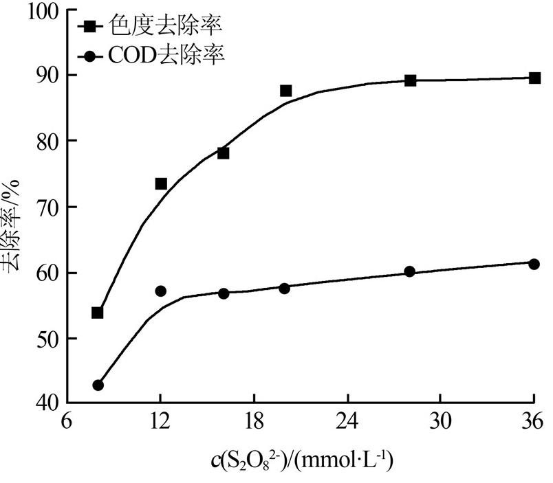 在初始pH=3.0,n(Fe2+)/n(S2O82-)=0.45,反應(yīng)時(shí)間為120 min的條件下,考察了S2O82-投加量對處理效果的影響,結(jié)果如圖 3所示。
