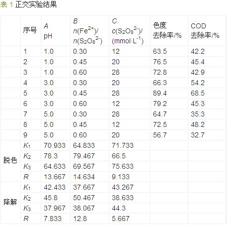 在單因素實(shí)驗(yàn)基礎(chǔ)上,以初始pH、n(Fe2+)/ n(S2O82-)、S2O82-投加量為影響因素,以色度去除率和COD去除率為評(píng)價(jià)指標(biāo)進(jìn)行了3因素3水平正交實(shí)驗(yàn),實(shí)驗(yàn)結(jié)果見表 1。
