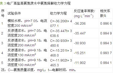 根據氨氮的間接電化學氧化機理,當溶液中存在足量的氯離子條件下,電解生成的有效氯足夠與氨氮發生氧化還原反應,反應過程不受有效氯限制。從試驗結果看,電解過程中氨氮濃度與電解時間呈近似線性關系,采用一元線性回歸對試驗數據進行處理,得到各試驗條件下氨氮降解的動力學方程、表觀反應速率常數及線性相關系數,結果見表 3。從動力學方程看,高鹽條件下,氨氮的電化學氧化符合準零級反應動力學規律。具體參見http://m.xhxdt.com更多相關技術文檔。