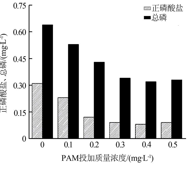 從圖 5可以看出,當PAM投加質量濃度為0.3 mg/L,經沉淀后總磷質量濃度可降低至0.4 mg/L以下,正磷酸鹽質量濃度降低至0.1 mg/L以下。當PAM投加質量濃度大于0.3 mg/L,總磷和正磷酸鹽濃度變化趨勢不明顯。從實驗現象可以看出,與不加PAM相比,加入PAM后形成的絮體體積更大,沉淀時間減少。但是,過多加入PAM,不僅會增加廢水處理藥劑費用,同時還會增加水體COD〔11〕。因此,實驗確定PAM的最佳投加質量濃度為0.3 mg/L。