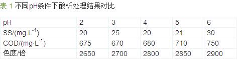 水性油墨廢水呈堿性,當(dāng)調(diào)至酸性后,水溶性樹(shù)脂會(huì)形成絮狀物并析出。如表 1所示,當(dāng)pH在2~6范圍變化時(shí),酸析過(guò)濾后的差別不明顯;pH在2~4時(shí)相對(duì)較好。SS經(jīng)酸析過(guò)濾后在20~30 mg/L,已達(dá)排放要求;COD降至約700 mg/L,去除率約80%;色度降至約2 800倍,去除率約30%。