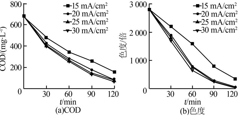 電流密度是影響電解速率及能源消耗的重要因素。采用自制的氧化錫電極,NaCl添加質(zhì)量濃度2g/L,極距10 mm,pH = 4條件下,研究了不同電流密度對(duì)電解處理廢水效率的影響,結(jié)果見(jiàn)圖 3。