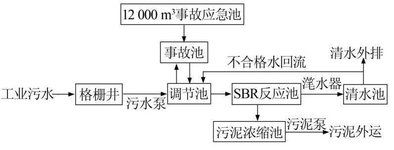 四川某甲醇生產企業的40m3/h廢水處理裝置于2005年建成投用,主要針對40萬t甲醇生產過程中產生的含醇廢水的處理,該廢水處理裝置采取SBR的處理工藝。SBR工藝以時間分割的操作方式替代空間分割的操作方式,靜置理想沉淀替代傳統的動態沉淀,即在同一池子內將進水、反應、沉淀、排水、閑置5個步驟融為一體,具有流程簡單、處理效果優異、運行靈活、適應水質變化能力較強等優點〔1〕。SBR污水處理流程示意如圖 1所示。