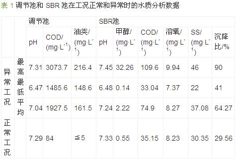 調節池和SBR池在工況正常和異常時的水質分析數據如表 1所示。