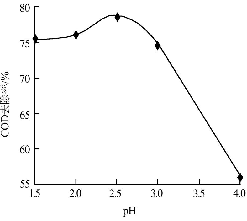 調節電解電壓為8 V,電解反應時間為75 min,取pH分別為1.5、2.0、2.5、3.0、4.0,考察pH對含油乳化廢水COD去除率的影響,實驗結果見圖 3。