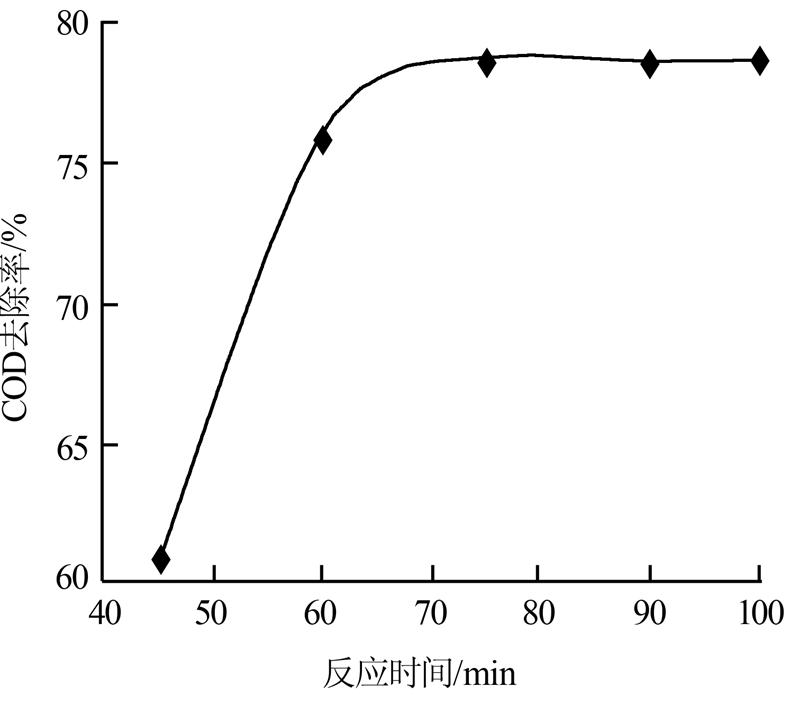 調節電解電壓為8 V,廢水pH=2.5,電解反應時間分別取45、60、75、90、100 min,考察反應時間對含油乳化廢水COD去除率的影響,實驗結果見圖 4。