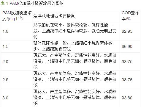 (3)絮凝實驗中助凝劑PAM投加的質量濃度為2 mg/L,最終得到COD的去除率為93%以上,出水COD低于300 mg/L,達到相關排放要求。