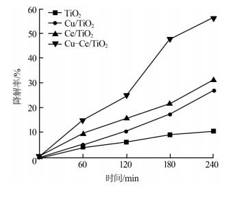 采用最優條件下制備的Ti2、Cu/Ti2、Ce/Ti2和Cu-Ce/Ti2于可見光條件下催化降解甲醛溶液,結果如圖 1所示。