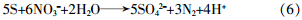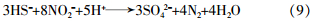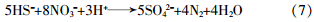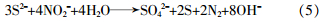 2007年Q. Mahmood等〔20〕提出,NO3--N與S2-(HS-)的反應產物與基質中的硫氮比有關。當硫氮質量比為3∶4時,反應產物為單質硫和SO42-〔見式(5)〕,說明在SRAO中不合適的硫氮比可使SO42-重新出現于產物中。