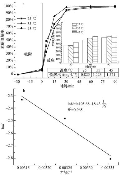 圖 5 不同反應溫度下苯酚降解及其COD去除效果的比較(a);苯酚降解反應的Arrhenius圖 (b)(pH=3.5,100 mg·L-1苯酚濃度,9.80 mmol·L-1 H2O2,0.5 g·L-1催化劑)
