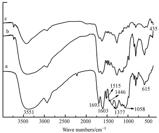 圖 5是苦丁茶提取液、Fe NPs 反應前后的的紅外譜圖.從圖 5a可知,3351 cm-1附近的吸收峰為羥基自由基的振動吸收峰,1693 cm-1處的強吸收峰為C O伸縮振動峰,1603、1515和1446 cm-1處的吸收峰為苦丁茶中苯環或雜芳環的骨架振動峰,在1377 cm-1處的吸收峰為苦丁茶提取液的特征峰,1058 cm-1處的吸收峰為C—O—C的對稱伸縮吸收峰,615 cm-1處的吸收峰為苦丁茶提取液在指紋區的特征吸收峰. 比較圖 5a和圖 5b可知,Fe NPs的紅外譜圖與苦丁茶提取液的各個官能團的特征吸收峰的變化不大,這可能是因為Fe NPs的表面被苦丁茶提取液中的有機物包裹,這些有機物如多酚及黃酮是納米鐵的掩蔽劑和穩定劑. 圖 5c是反應后的Fe NPs紅外譜圖,與圖 5b比較,在435 cm-1附近出現一個新的特征吸收峰,這是Fe2O3和Fe3O4中的Fe—O伸縮振動峰,說明Fe NPs在同時去除Pb(Ⅱ)和Cd(Ⅱ)的過程中納米鐵被氧化生成Fe2O3和Fe3O4.