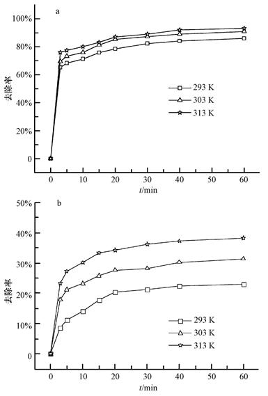 圖 6 不同溫度對Fe NPs同時去除水溶液中的Pb(Ⅱ)和Cd(Ⅱ)的影響(a. Pb(Ⅱ); b. Cd(Ⅱ))