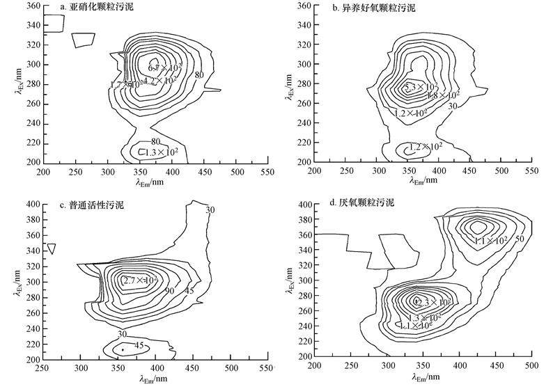 圖 3 4類污泥樣品EPS的三維熒光圖譜 (等高線表征熒光強度)