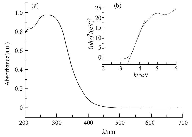 圖 3為In2TiO5樣品的UV-vis DRS圖.由圖 3a可知,樣品在200~500 nm范圍內均有一定的吸收,且主要吸收在紫外區,在可見光區的吸收很小.根據Tauc法則,得到的(αhν)2-hν關系曲線如圖 3b所示,其中α是半導體的光吸收系數,hν為入射光子能量.將內插圖曲線的線性部分外延至與橫坐標相交,則交點值即為樣品的禁帶寬度.由圖 3b可知,In2TiO5納米帶的禁帶寬度Eg為3.47 eV,稍大于Wang等(2007)采用低溫燃燒法制備In2TiO5粉體禁帶寬度Eg(3.02 eV),這是因為In2TiO5納米帶的晶粒粒徑(48.9 nm)遠遠小于In2TiO5粉體(160 nm),受量子尺寸效應的影響,使得In2TiO5納米帶的禁帶寬度大于In2TiO5粉體.