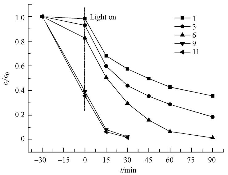 被降解物質水溶液的pH也是影響光催化效率的重要因素,因為溶液pH的變化會引起界面電荷性質的變化,進而改變納米粒子在溶液中的分散情況.為進一步證實溶液的酸度對In2TiO5納米帶光催化效果的影響,選擇MB為降解對象,進行了不同pH條件下MB的光催化降解實驗,結果如圖 6所示.從圖可以看出,在同樣條件下,樣品的光催化降解效率隨著溶液pH的增大而增大.當溶液pH大于9時,In2TiO5樣品的吸附能力約為pH 3.0的3倍.這是因為在堿性條件下In2TiO5粒子帶負電,而MB分子帶正電,兩者靠庫侖力緊密吸附在催化劑表面形成雙電層,雙電層產生的Zeta電位越大,則斥力越大,越有利于分散;當庫侖力小于范德華力時,粒子將發生團聚.