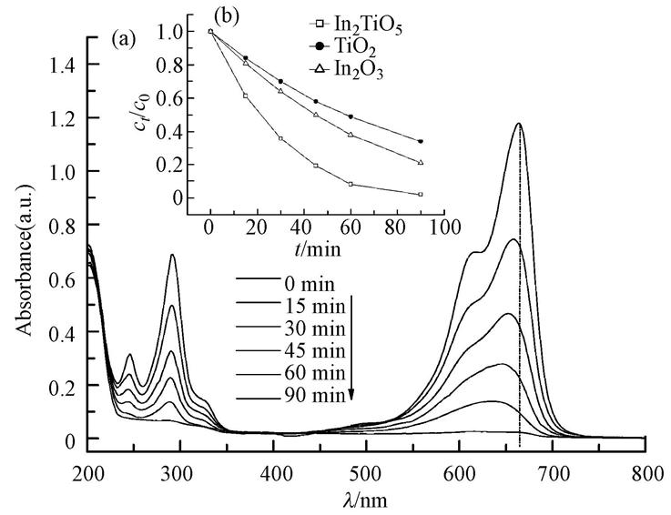 In2TiO5納米帶在不同時間降解MB的紫外-可見吸收光譜如圖 8a所示.從圖可以看出,隨著光照時間的增加,MB在紫外光區230~330 nm(苯環)和可見光區664 nm(二甲氨基)處的的特征峰逐漸降低,90 min后,MB的特征峰消失,降解率達98.1%.同時發現MB在可見光區的吸收峰從664 nm藍移至610 nm,這說明MB在In2TiO5的作用下發生了去甲基化作用,導致MB脫掉兩個甲基,在不同時間分別形成天青B和天青A,同時苯環也被破壞,與文獻報道(Zhang et al., 2002)天青B和天青A的特征吸收峰分別在654~648 nm和620 nm處基本一致.MB特征吸收峰的藍移說明MB已被In2TiO5光催化降解.不同催化劑對MB的光催化降解效果如圖 8b所示,由圖可知,在高壓汞燈輻照下,60 min,In2TiO5納米帶對MB的降解率達91.9%,而TiO2和In2O3的降解率僅為51.2%和62.1%.由此可見,In2TiO5中[InO6]和[TiO6]的八面體構建的三維隧道結構,加快了光生電子-空穴的分離,使得光催化劑的光催化活性得到明顯的提高.