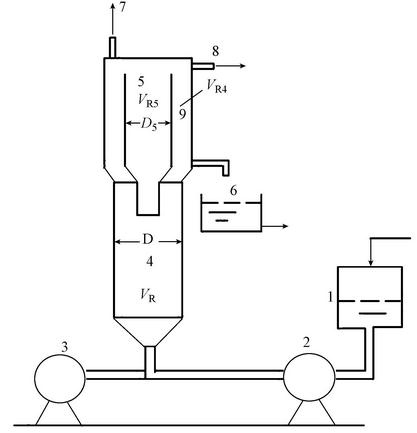 圖1 工藝流程示意圖(1.進水罐,2.蠕動泵,3.氣泵,4.主反應區,5.內反應區,6.出水口,7.氣體出口,8.反應液出口,9.環隙反應區)