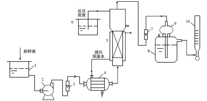 圖2 驗證實驗工藝流程示意圖(1.原料液儲槽,2.蠕動泵,3.流量計,4.換熱器,5.反應器,6.反應廢液槽,7.氣體流量計,8.液封槽,9.緩沖瓶,10.皂沫流量計)