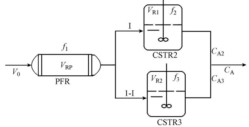 設反應器主反應區總體積為VR,等于模型中各反應區體積VRi之和,設PFR的體積分率為f1,CSTR2、CSTR3的體積分率分別為f2、f3,總流量為v0,流經CSTR2的流量分率為I,某時刻流出CSTR2、CSTR3全混區的流體中示蹤劑濃度分別為CA2、CA3,混合后出口總濃度為CA.當t=0時,在PFR反應器入口處,脈沖法加入質量為M的飽和示蹤劑A.對于PFR: