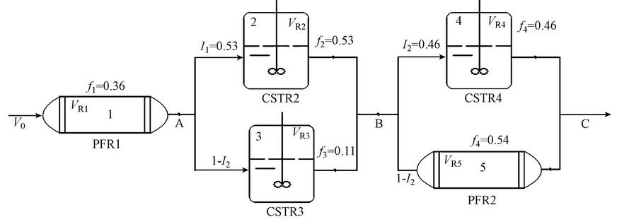3.2 內循環厭氧反應器模擬 3.2.1 內循環厭氧反應器反應過程模型的建立及驗證 1)反應器反應過程模型建立 根據以上停留時間分布的特點,厭氧反應器由主、次反應區組成,因此,可用圖 4中的組合模型模擬反應器反應過程行為.圖 4所示組合模型中,根據停留時間分布規律,1、2、3擬合的是厭氧反應器主反應區;次反應區由中間回流區和環隙區構成,中間回流區可作為平推流處理,環隙區由于有大量產物氣體流過,可作為全混區處理,所以反應器次反應區可由4、5并聯進行擬合. 圖4 反應器反應過程模型組合示意圖 模型中各參數的確定:針對本反應器,實際反應過程中生成的氣量在90~180 mL · h-1之間,因此,模型中主反應區各參數取其平均值,具體如下:f1=0.36,f2=0.53,f3=0.11,I1=0.53. 次反應區流量分率為: