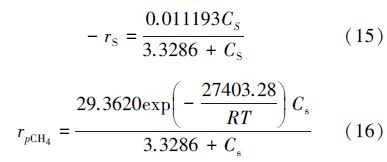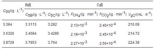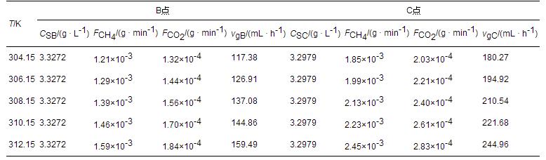 式中,Cs為反應器中廢液濃度(g · L-1),-rs為廢液COD消耗速率(g · min-1 · L-1),rpCH4為甲烷生成速率(g · min-1 · L-1),rpCO2為二氧化碳生成速率(g · min-1 · L-1),模擬計算了反應器單程轉化過程,主、次反應區出口即B、C兩點處計算值如表 4所示.以基質初始濃度CS0=3.3840 g · L-1為例,實驗數據及處理如表 5所示. 表4 主、次反應區出口處B、C兩點狀態數據 表5 驗證實驗各點狀態數據一覽 CH4體積流量vCH4實為193.81 mL · h-1,CH4質量流量FCH4實為2.045×10-3 g · min-1.同理,可計算CO2體積流量、質量流量分別為8.75 mL · h-1、2.54×10-4 g · min-1.誤差按(實驗值-計算值)/實驗值×100%計算,可知本組B點基質濃度CSB誤差最大,為7.86%. 由表中數據可見:不同時刻反應器出口C點的氣體體積流量v大于模擬計算時的體積流量vgC,其原因可能是該驗證實驗時間不夠長,系統中存在一定的N2,同時反應過程中生成其它氣體所致.其余兩組數據計算依此類推,最后得到不同濃度時,C點出口處CH4體積流量最大誤差為9.67%,CO2體積流量最大誤差為8.53%,可見所建立的組合模型能夠反映反應器實際操作狀況. 3.2.2 內循環厭氧反應器模擬計算 根據以上反應過程模型,模擬了初始COD、溫度變化對厭氧反應器狀態的影響. 1)初始COD變化對反應器操作狀態影響的模擬研究 操作參數為:廢液體積流量v0L=15 L · h-1,溫度35 ℃,改變COD初始值,B、C兩處模擬數據如表 6所示.由表 6中數據可知,當溫度一定時,隨著基質初始濃度的增高,B、C兩處基質濃度也隨之升高,產物CH4、CO2的質量流量也升高. 表6 反應器出口處B、C兩點狀態隨基質濃度變化關系 2)反應溫度變化對反應器操作狀態影響模擬研究 操作參數為:廢液體積流量v0L=15 L · h-1,COD初始值CS0=3.40 g · L-1,改變溫度,B、C兩處模擬數據如表 7所示.由表 7中數據可知,在基質初始濃度一定時,隨著溫度的升高,B、C兩處的基質濃度不變,這主要是由于在該溫度范圍內,基質消耗活化能很低,以致消耗速率幾乎不隨溫度變化而形成的結果;但產物CH4、CO2的質量流量隨溫度的升高而升高,同時CO2的增加速率要快于CH4,這主要是由于CO2生成活化能高于CH4,故其生成速率對溫度更為敏感.具體參見污水寶商城資料或http://m.xhxdt.com更多相關技術文檔。 表7 反應器出口處B、C兩點狀態隨基質溫度變化關系 4 結論 1)通過對反應器主反應區停留時間分布的考察,主反應區流型可以用一平推流區與兩個并聯的全混區進行串聯組成,各區所占體積分率隨反應過程中所產氣體流量不同而不同,隨著氣體流量的增大,平推流區所占體積分率減小. 2)次反應區由平推流區和全混區并聯組合而成,整個厭氧反應器由主反應區和次反應區串聯組合而成,根據實驗數據可知,C點出口處CH4體積流量最大誤差為9.67%,在可允許的范圍內,說明該組合模型較好地模擬了反應器的實際狀態. 3)采取單因素分析方法,模擬了基質初始COD和溫度變化對反應器出口狀態的影響,發現產物CH4、CO2的質量流量隨基質濃度、溫度的升高而升高;在304.15~312.15 K范圍內,溫度的變化對出口處基質濃度的影響不大.