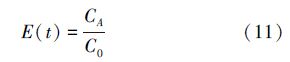 對模型求解轉化為求解一個三參數I、f1、f2的E(t)方程,其中,t¯t¯p不是獨立的. 3 實驗結果及模型參數求解 3.1 主反應區停留時間分布測定 實驗是在清水流量為15 L · h-1,氣體平均流量分別為0、90.0、182.1 mL · h-1條件下進行測定的,示蹤劑脈沖加入,部分實驗數據如表 1所示. 根據
